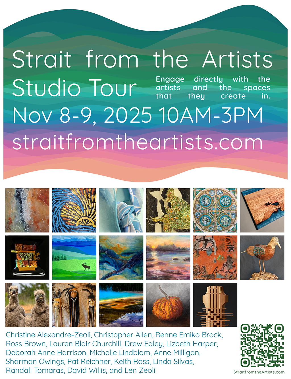 Mark your calendar for the Fourth Annual Strait from the Artists Studio Tour a celebration and sale of meaningful, locally made art on the Olympic Peninsula. Join us Saturday, November 8 and Sunday, November 9, 2025, from 10:00 AM to 3:00 PM for an inspiring, self-guided adventure through artist studios and exhibition spaces for free.